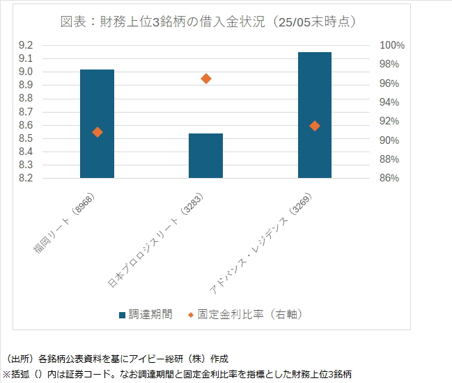具体的に、固定金利比率と調達期間をベース(※2)算出した金利上昇の影響が少ない上位3銘柄を示したものが図表となっている。