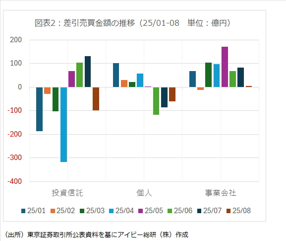 すでに個人投資家は、図表2の通り、6月から利益確定の売り越し基調が続いており、5月以降に買い越しに転じていた投資信託も8月には売り越しとなっている。さらに価格上昇を支えてきた事業会社の買い越し額は、8月は5億円程度まで減少している。