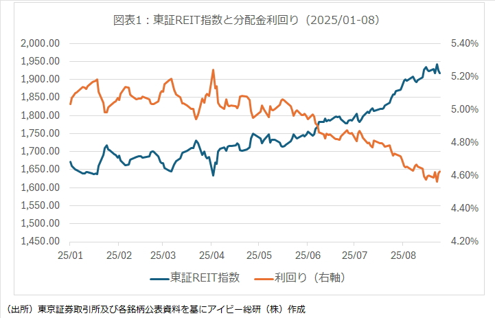 8月末まで続いていたJ-REIT価格の上昇基調は、一服する状態となっている。東証REIT指数は、図表1の通り、6月上旬から8月下旬まで上昇が続き、月末は1,917ポイントで取引を終えた。2022年11月以来となる月末時点で1,900ポイントを超えた。