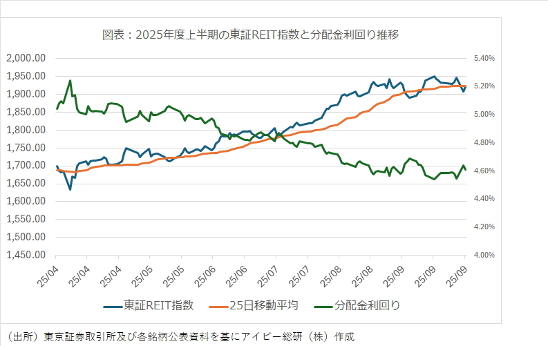 2025年度上半期(4月~9月)に東証REIT指数は13.6%の上昇となり、前述の通り1,900ポイント台で取引を終えた(図表)。前月比騰落率も4月から9月まで6ヶ月連続で上昇となっている。
