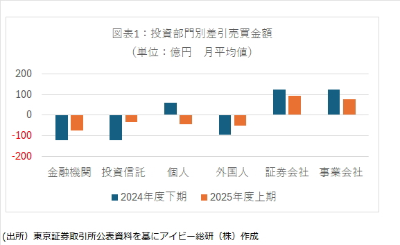 2024年度下半期(2024年10月~2025年3月)と25年度上半期の比較では、個人が買い越しから売り越しに転じた以外は、売り越し主体と買い越し主体ともに減少している。