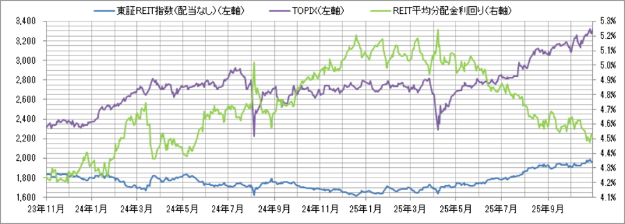 REIT指数と予想分配金利回りの推移>  (グラフは2023年11月~2025年10月の24ヶ月間)