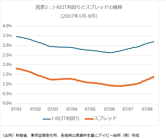しかし、スプレッドはさらに縮小の余地があると考えられる。上記の東証REIT指数が2,000ポイントを超えていた期間で、2007年だけが異次元金融緩和状態ではなかった時期となっている。この時期のスプレッドは図表2の通り、2%以下で推移していた。
