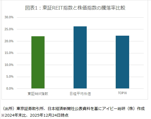2025年のJ-REIT価格は、大幅とも言える上昇基調となった。東証REIT指数は11月には2,000ポイント台を回復するなど、年初から22%上昇(12月24日時点)した。図表1の通り同期間で比較すると、TOPIXとは同程度、日経平均株価に対してはアンダーパフォームとなっているが乖離幅は小さい。2024年末のJ-REITの利回りが5%を超えていた点も加味すると、日経平均株価と同程度のトータルリターンとなっている。