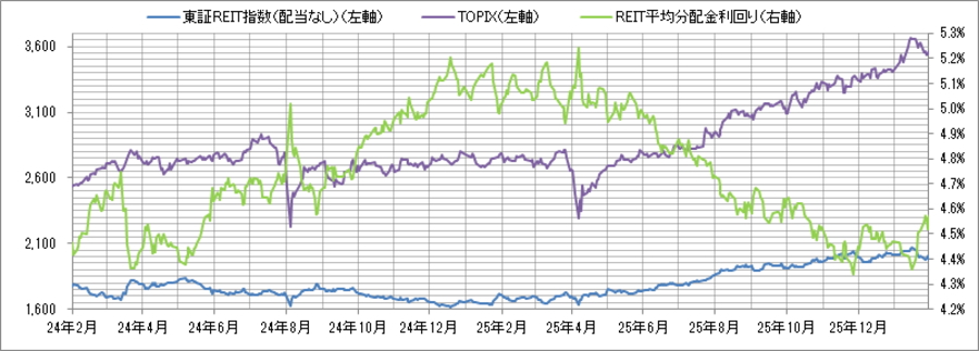 <東証REIT指数と予想分配金利回りの推移> (グラフは2024年2月~2026年1月の24ヶ月間)